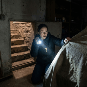 The darkness swallowed her whole. Clara moved down the stone steps slowly, one hand trailing along the damp concrete wall, the other gripping the flashlight like it was a lifeline. The air grew colder with each step musty and sharp, like old leather and forgotten oil.