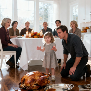 The moment the turkey hit the hardwood floor, the room fell silent in a way I had never heard during a Thanksgiving dinner. The platter clattered, gravy splattered across the carpet, and my five-year-old daughter, Emma, stood trembling beside the overturned bird like a small but fierce guardian. My parents, my sister Hannah, her husband David, and my in-laws stared at her as if she had just committed a national crime. I quickly knelt down in front of her, trying to keep my breathing steady despite the shock vibrating through my chest.