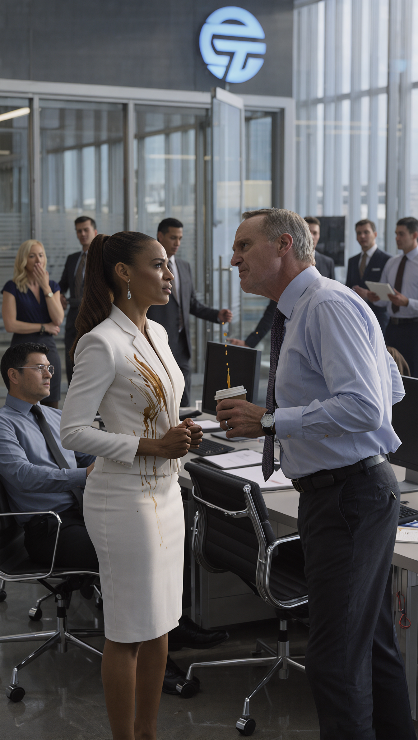 Before Angela could respond, he tilted his cup and spilled hot coffee across her white blouse. Gasps filled the room as colleagues froze in disbelief.