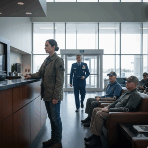 Dulles Airport carried that particular winter light that looks warm but never is, the sun reflecting off glass while the air sneaks cold through every seam. Madison Carter moved with the slow gravity of a traveler who had crossed too many time zones to care about the opinions of strangers. She wore worn jeans, a salt-stained field jacket, and boots that had earned their scuffs on steel decks rather than sidewalks. The carry-on behind her had lost a wheel somewhere between Bahrain and Boston, but it still followed. The USO lounge stood quiet behind frosted glass, a soft pocket of carpet and coffee in the middle of moving crowds. Madison stepped toward the counter without anticipation, the way you do when you already know the answer but need the ritual anyway. The young attendant glanced from the lettering on the door to the denim at her knees and back again. He straightened as rules stood up inside him.