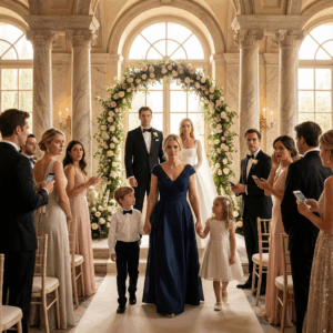 Lila entered quietly, wearing a navy-blue dress that modestly complimented her figure. Her hair was pulled back, and on each side of her stood a child—one boy, one girl, both around six years old. Their expressions mirrored each other: curious, calm, and wide-eyed as the