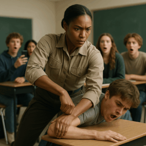 In an instant that left the room silent, Naomi moved. She twisted her body, breaking Tyler’s grip with effortless precision, and pinned his wrist against the desk with a technique so fast it blurred. His face went pale. His friends stumbled back, stunned.