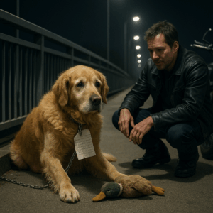 A Golden Retriever lay chained to the bridge’s concrete railing, barely lifting her head when my light reached her. Even from a distance, I could see the massive tumor protruding from her belly—easily the size of a softball. Her breathing was labored and shallow, each breath a struggle.