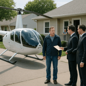When John finally reached his street, he couldn’t believe his eyes. There, right in front of his modest house, was a large, sleek helicopter. Several people in suits stood around, as if they had been waiting for him.