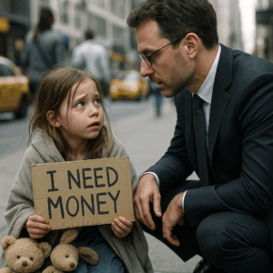 Right on the corner of 42nd Street, a little girl sat on a thin blanket. Her face was smudged with dirt, her striped shirt worn out, but her wide brown eyes told a story that words could never fully express. In front of her were a few toys: a small teddy bear, two toy cars, and a rag doll with fading yarn hair. She held up a piece of cardboard with shaky handwriting: “$20 FOR SALE.”