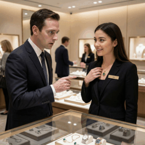 I looked up. A young sales associate stood behind the counter. She had dark hair pulled back in a professional bun, and soft, intelligent eyes.