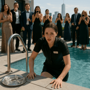 The music was loud, laughter echoed around the rooftop pool, and the scent of expensive champagne lingered in the air. It was one of those extravagant parties where the wealthy gathered to flaunt their money, connections, and polished lives. Among the crowd of glittering gowns and tailored suits, Emily Harris stood out—not because she belonged there, but because she didn’t.