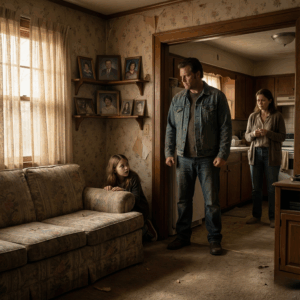 The living room was dark, curtains drawn tight allowing only a sliver of light through the edges. On a dusty shelf, family photos sat untouched. Sarah and Ellie, smiling in moments long gone.
