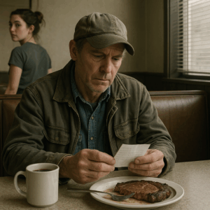 Jenna came back a few minutes later, eyes low, and refilled his coffee without being asked. Professional. Efficient. Anticipating needs—the mark of someone who’d been doing this work long enough to read customers instinctively. She set the check down with a folded receipt tucked inside the standard black leather folder every restaurant in America seemed to use.