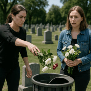 That morning, the cemetery was hauntingly silent, with only the gentle rustle of leaves breaking the stillness as I walked. As I walked toward my parents’ graves, I felt a blend of nervousness and resolve. When I arrived at my mother’s resting place, I felt a sudden stillness wash over me. There, next to her grave, stood a woman around my age, her back to me as she carefully gathered the flowers I had left the week before and tossed them into a nearby trash can.