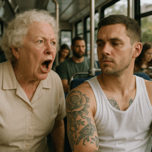 The bus had just pulled away from the Pine Street stop when an elderly woman in a burgundy wool coat settled into the seat across the aisle from a young man who couldn’t have been older than twenty-five. He was wearing a plain white t-shirt despite the February chill, and both of his arms were covered in elaborate tattoos—intricate designs that looked professionally done and probably expensive.