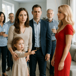 The room fell silent. Every guest at the party froze, glasses mid-air, laughter dying instantly. My 4-year-old daughter, Lily, stood beside me, clutching her toy rabbit, looking up at me with wide, innocent eyes.