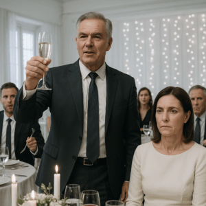 As dessert was served—a decadent chocolate torte with raspberry coulis—John stood up. He picked up his champagne glass and tapped it with a spoon, the clear ring of crystal against silver cutting through the conversation and music. The room hushed. Everyone turned toward him, expecting a heartfelt toast, the kind of romantic declaration that makes guests sigh and remember why they believe in marriage.
