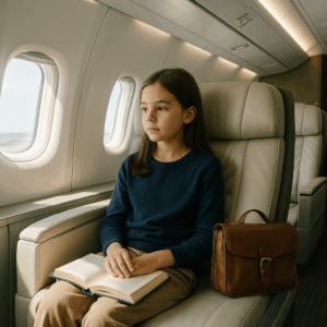 She navigates the first-class cabin with practiced ease, finding her window seat in the second row. Setting her satchel on the floor, she slides into 2A, immediately fastening her seatbelt and adjusting the air vent above, routines ingrained through dozens of flights with her parents. Marion Delaney, the chief flight attendant, approaches with a professional smile.