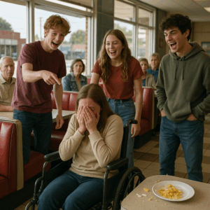 Abigail’s face held the weary grace of someone who had long navigated a difficult path. Her hands, however, trembled slightly as she tried to ignore the boys. They didn’t just mock her; they crossed a boundary that separates childish pranks from real malice. With a sudden motion, one of the boys swung his arm, sending her plate of pancakes flying to the floor. Another gave her wheelchair a hard shove, pushing her back with a sneering laugh. The diner’s comforting hum died instantly. The only sound was the crash of the plate and the triumphant jeers of the bullies.