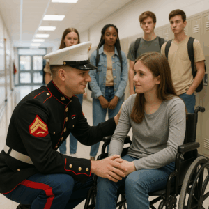 She sat helpless in the cafeteria, her broken wheelchair in pieces around her, classmates laughing, phones recording. Then the cafeteria doors swung open. A man in a marine uniform stood there, tall, scarred, and furious.