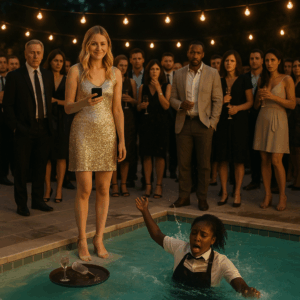 The music was loud, the champagne sparkled, and laughter filled the air — until a cruel splash silenced everything. Everyone turned toward the pool, where a young Black waitress, soaked from head to toe, gasped for air, her tray of empty glasses sinking beside her. The culprit? Karen Holloway — the wealthy hostess of the party, standing by the edge with a smirk on her red lips.