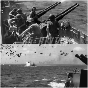 The 5-inch mounts roared to life. Russell watched through his binoculars. The shells arced up—and then, at what looked like exactly the right altitude and distance from the incoming aircraft, they began to burst. Not randomly, not in scattered patterns, but right in front of the bombers. Clouds of shrapnel appeared precisely in the path of the formation.