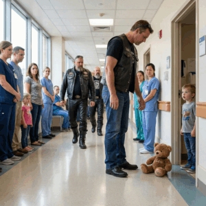 Damon walked out first—broad-shouldered and imposing in his leather vest, his presence commanding immediate attention. Behind him came a dozen men and women who looked like they could bench press small cars. Their boots echoed on the polished hospital floor as staff members and visitors instinctively moved aside.