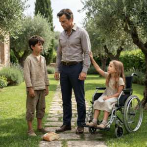 As he stepped through the rear hallway of his mansion and into the sun-drenched garden, something caught his eye. There, beneath the shade of an old olive tree, sat his daughter Lily in her wheelchair. For months, Lily hadn’t smiled—not once since the accident. But now… she was giggling. Her blue eyes sparkled with life as she looked up at a boy Jacob had never seen before.