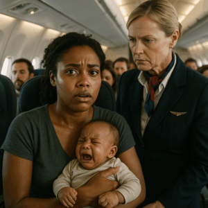 The late afternoon sun filtered through the airplane windows as Flight 724 cruised somewhere between Chicago and New York. Passengers shifted in their seats, some scrolling through phones in airplane mode, others trying to nap through the low hum of the engines. Near the back of the aircraft, a young Black mother named Danielle Harris cradled her six-month-old daughter, Mia, who had begun to fuss. Danielle had already tried everything—rocking, whispering, gently bouncing the baby on her lap—but the confined space and the pressure in the cabin made Mia restless.