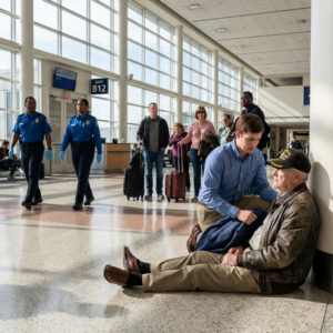 Don’t worry, sir, I’ll stay with you until someone comes. The young man said it calmly, helping the elderly veteran who had collapsed near gate 17. He gave up his seat, missed his flight, and stayed beside him in silence.