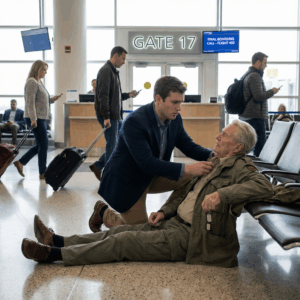 He simply stayed one hand resting lightly on the older man’s shoulder while passengers streamed past to board the plane that would leave without him. Airport medics arrived within minutes rolling a gurney that squeaked faintly against the polished terminal floor. They performed a quick assessment, blood pressure pulse, basic neurological checks, and called for an ambulance transport to the nearest hospital.
