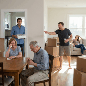 I stepped inside. My mother was in the kitchen holding a dish towel like it was a white flag. Her eyes were red. My father sat in a chair, shoulders hunched, hands shaking. Boxes everywhere. Loud voices from the hallway. A child’s cartoon blaring in the living room I hadn’t even turned on.