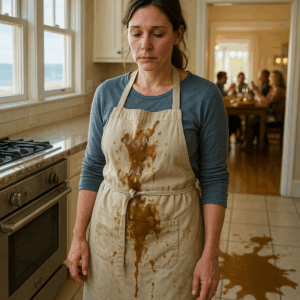 The clang of a metal spoon hitting the tile floor rang sharp in the kitchen, echoing against the cold stone walls. Thick brown gravy splattered across my apron, creating an abstract pattern that somehow perfectly captured my family’s indifference. Just a few steps away, the dining room pulsed with laughter, glasses clinking together in a harmony I was never invited to join.