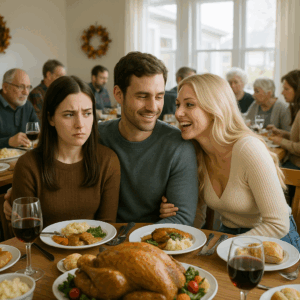 She kissed everyone hello and landed on the couch between us like she owned it, pressing her knee against Marcus’s.