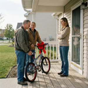 I opened it to find my parents standing there. Mom was holding a new bike—almost identical to the one Dad had destroyed. Dad stood next to her, looking uncomfortable but less angry than before.