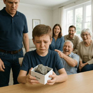 Max lifted the lid. His smile froze. Inside the pristine white iPhone box was a jagged rock. Just a rock. A stupid, dirty rock that looked like it had been yanked from the edge of someone’s driveway.