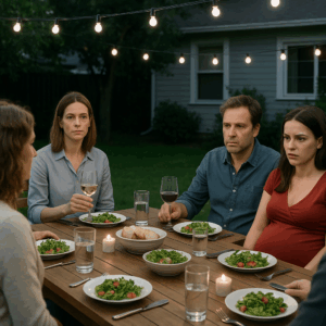 The conversation at our dinner table died instantly. Forks paused halfway to mouths. Wine glasses froze in mid-sip. Everyone turned to stare at this unexpected guest who was clearly expecting a child.