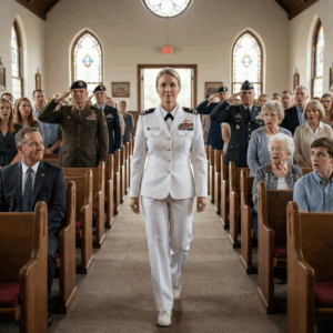 His question hung in the air, drawing attention from every guest, all eyes suddenly focused on the woman in white standing at the back of the church—not bridal white but naval white, not delicate but disciplined, not asking for approval but commanding respect.