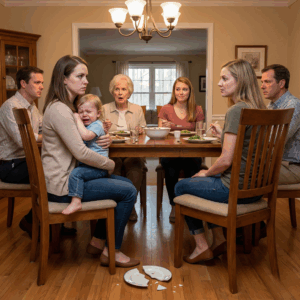 And then, in a movement so fast I barely processed it, she tilted the plate and dumped its contents onto the floor at Emma’s feet. Pot roast, mashed potatoes, gravy, peas—everything crashed onto Mom’s polished hardwood in a scattered mess.