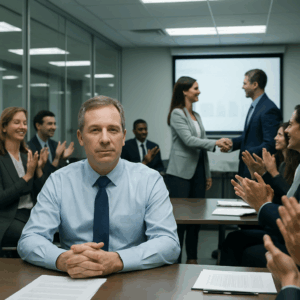 I felt my hands clap before I even registered the sound, loud, cheerful. I congratulated her with a smile wide enough to convince the room. That’s how I’ve survived here, always the steady one, always the man who doesn’t flinch. But inside, I felt the floor give way. Not rage, not even heartbreak, something sharper, colder. She floated to the front of the room, soaking in the applause like sunlight beaming in. Away only the office favorite can beam when she’s handed something she never earned.