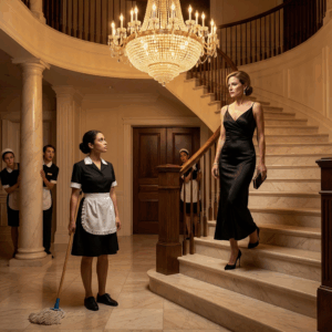 Click, clack, click, clack—stiletto heels, pointed ones—then stillness. Sophia glanced upward, and there she stood. Madam Emily, poised at the staircase’s summit in a burgundy satin robe, cradling a mug of herbal tea as if she commanded the entire universe.