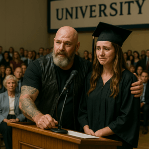 The other bikers surrounded them, and suddenly it was a group hug on stage at a formal graduation ceremony, and nobody cared about protocol anymore. People were standing, applauding, crying. The photographer was snapping pictures frantically. Someone’s phone was recording and would later make the video go viral.
