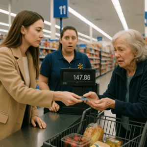 At the front register, an elderly woman stood fumbling through a worn leather wallet while the cashier watched with barely concealed impatience. The woman’s hands shook slightly as she searched for money she clearly didn’t have, coins spilling across the counter.
