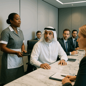 At the far end of the long marble conference table sat Sheikh Hassan al-Rashid, his impeccably tailored gray suit, reflecting the soft chandelier light. His words, spoken seconds earlier in a dialect of Arabic unfamiliar to most American ears, still hung in the air like a smoke nobody had noticed until it stung. The voice had come from the side wall, not from any of the translators, or the legal team, or even the row of executive assistants silently typing notes.