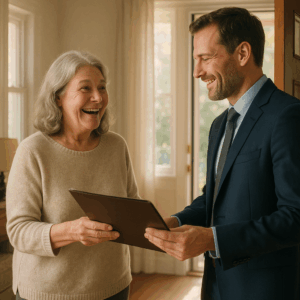 Yet, someone did. The sound was clear and assured. I caught sight of a man outside the window, dressed in a sharp suit and carrying a stylish leather folder. For a brief moment, I worried he might be from a financial institution, here to remind me about overdue statements. As I opened the door just a little, my heart tightened, and I asked, “Can I help you?”