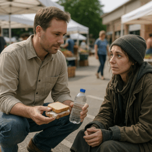 One chilly afternoon, as winter began to fade, I stopped by the local farmer’s market. That’s where I saw her — a thin woman sitting near the parking lot, her hand outstretched, asking for food.