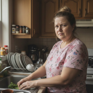 A middle-aged Caucasian woman is the central subject, positioned slightly to the right of the frame. She appears to be in her late 30s or early 40s. She has a round face with a slightly sad expression, and she is gazing directly at the viewer with a furrowed brow, conveying a look of concern or tiredness. Her build is plus-size. She wears a pink t-shirt with a floral print underneath. Her hair is pulled up in a messy bun. She’s standing at a kitchen sink, washing dishes. Her hands are in the sink, scrubbing some vegetables. The setting is a cozy, cluttered kitchen with wooden cabinets, a window, and dishware. The lighting is natural, with soft light illuminating the scene, particularly highlighting the woman’s face and the kitchenware. The image has a warm, realistic, and slightly desaturated color palette, suggesting a domestic, everyday scene. The composition is a medium shot, with a focus on the subject and her immediate surroundings.