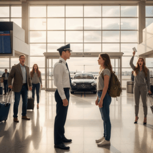 Gasps rippled through the crowd as the officer gestured toward the private terminal beyond the security barrier. A sleek black car waited near the runway.