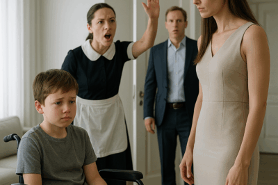 The 7-Year-Old Boy in a Wheelchair Tried to Hold Back His Tears as His Stepmother Humiliated Him Without Mercy. But Before She Could Say Anything Worse, the Housemaid Appeared at the Door and Shouted, “Don’t do that!” Her voice echoed through the entire room. The millionaire, who had just arrived, froze at the sight.