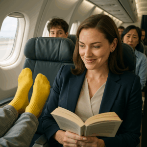 Ten minutes after takeoff, I settled into my window seat: headphones in, book open, tray table up, the quiet rhythm of flight beginning to hum. Then something cold and gritty touched my arm. I turned—and froze. A sock, once white and now bravely gray, was draped across my armrest like it had paid for the seat.