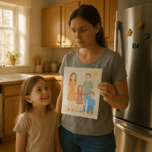 I turned from the stove, spatula midair, and took the paper from her tiny hands. It was a typical kid drawing — uneven lines, bright colors, big heads, small bodies. Me with long hair. My husband, David, with short brown hair and that big square smile she loved to exaggerate. Our daughter in her favorite pink dress, a sun in the corner, flowers along the bottom, little hearts floating above us.