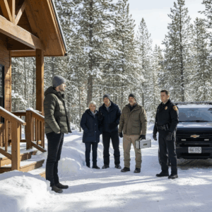 But before the locksmith touched the lock again, a patrol SUV rolled up the driveway, tires crunching through snow. Deputy Carter stepped out, hand resting near his radio.