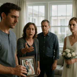 I glance around our living room at the framed photos we just hung—pictures from our wedding filled with laughter, friends, Nathan’s parents… and two glaringly empty chairs.