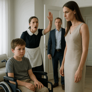The seven-year-old boy in a wheelchair tried to stifle his tears as his stepmother mercilessly humiliated him. But before she could say anything worse, the housekeeper appeared in the doorway and shouted, “Don’t do that!” The voice echoed throughout the room. The millionaire, who had just arrived, froze at the sight.